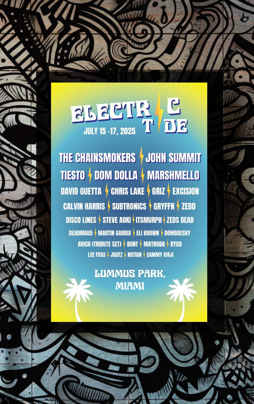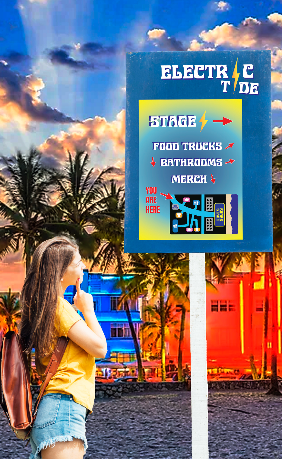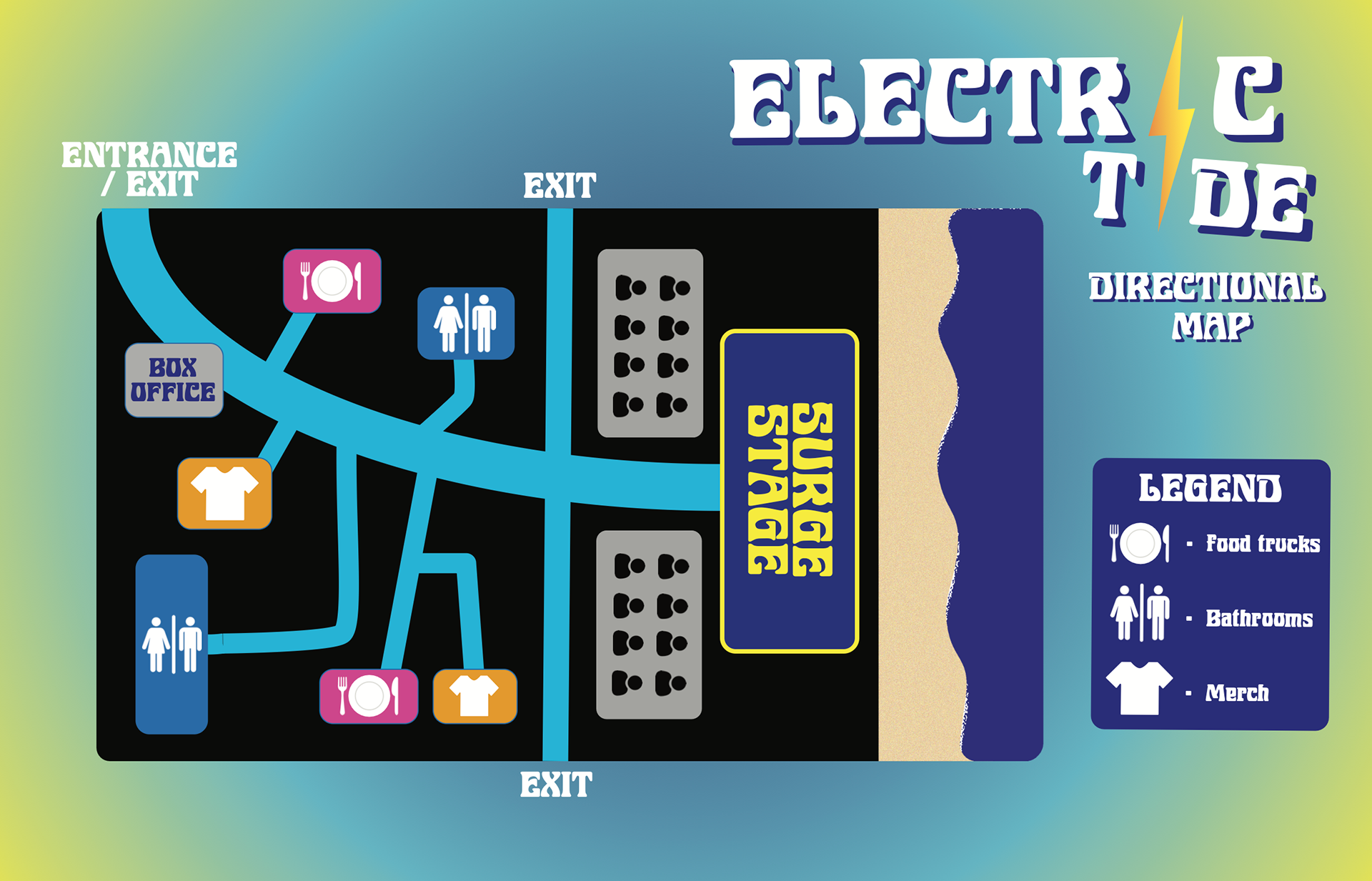 Electric Tide Miami is a two-day EDM festival concept built around energy, movement, and connection. The maps, stage signage, and directional systems were designed to guide thousands of attendees through a lively, fast-paced environment.