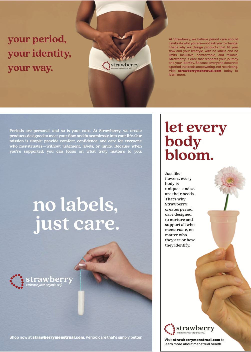 Periods are natural, and the Strawberry brand was created to make period care feel the same way: natural, inclusive, and empowering. For this project, I used Strawberry branding created by a classmate to make all of the deliverables and advertisements to help further their vision with the brand.